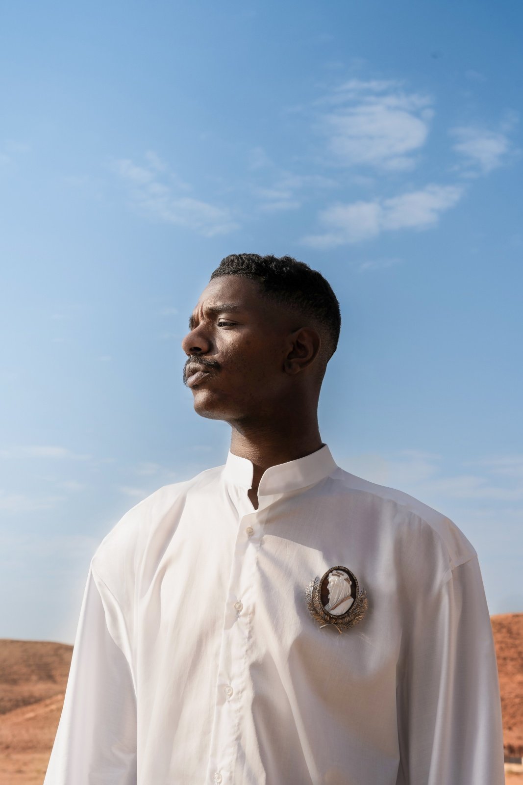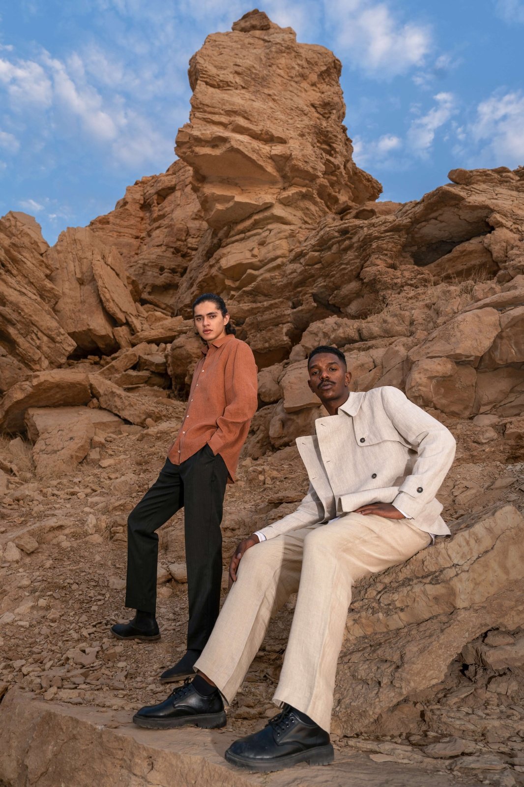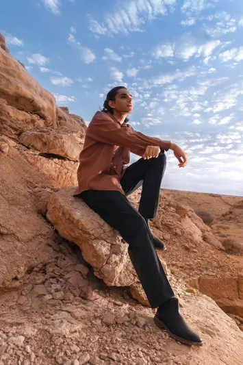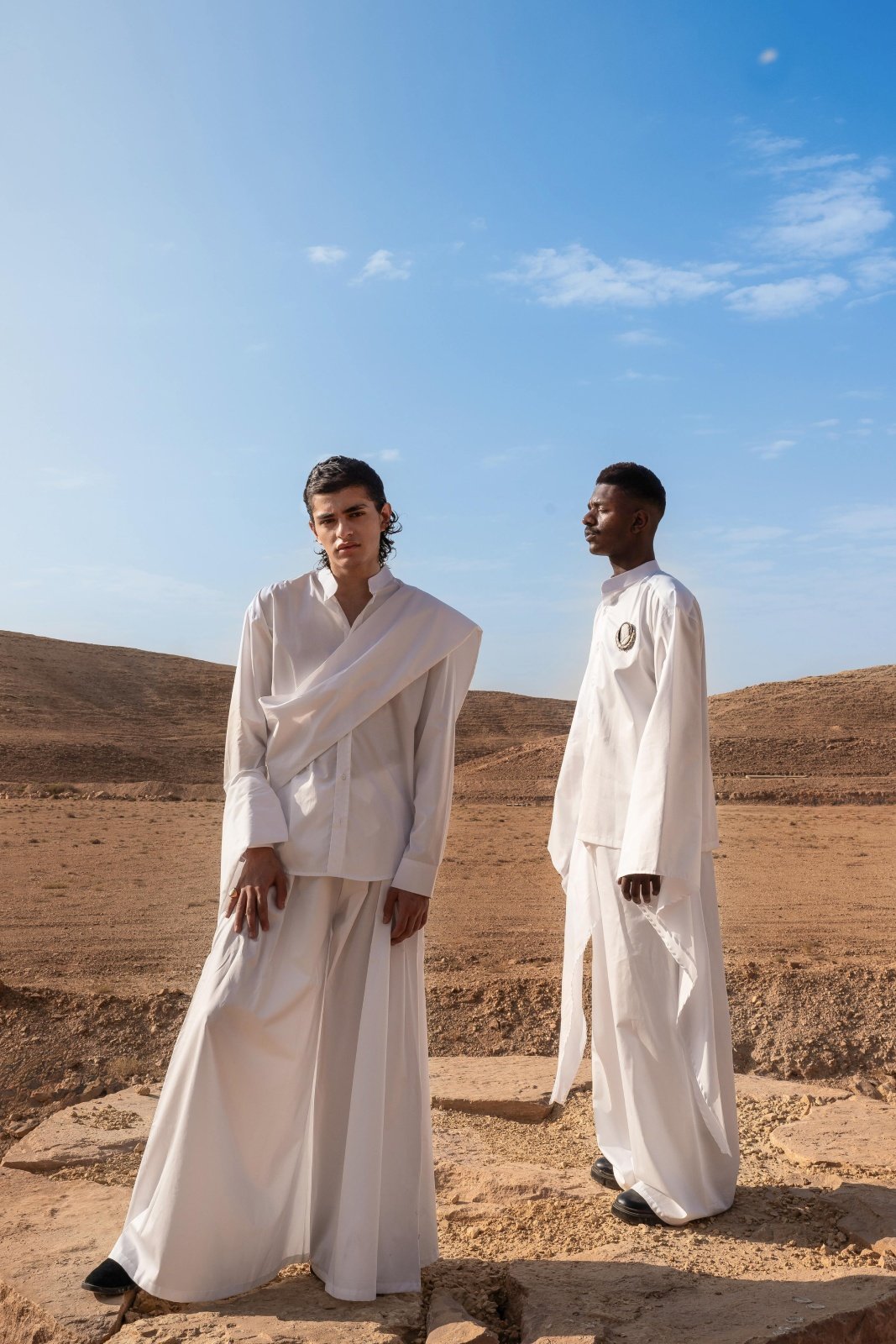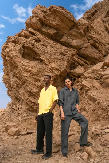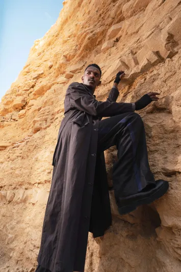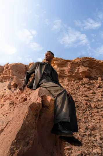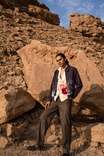 This photoshoot presents a new sartorial language for modern menswear, directly inspired by the textures and colors of the Saudi desert. It showcases innovative designs from contemporary Saudi brands, highlighting key trends such as flowing silhouettes, monochromatic dressing, and the revival of the men’s brooch.