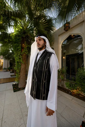 This shoot features a contemporary vision of traditional Saudi luxury attire. This editorial showcases key heritage garments—including the Bisht, Daglah, and Ghutra—from specialized Saudi designers, articulating a narrative where deep-rooted cultural symbols and meticulous craftsmanship are seamlessly blended with a modern, sophisticated aesthetic.