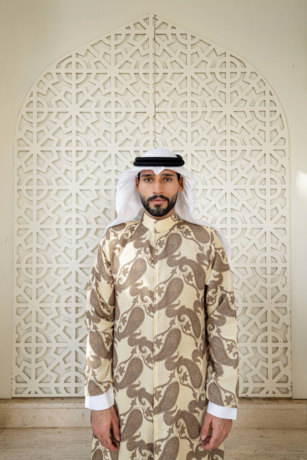 دقلة مميّزة بقصّة أنيقة من مجموعة Sdairiyah منفّذة بقماش فاخر باللون البيج تزيّنه رسوم الكشمير باللون اللبني، تتناسق مع غترة رائعة بقماشها الأبيض الناصع من Lomar – المصدر: الرجل